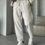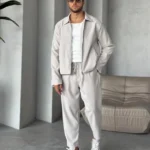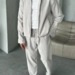 Този стилен мъжки комплект съчетава удобството на спортната визия с изчистения елегантен стил. Състои се от горна част със свободна кройка и панталон с ластичен колан и връзки за максимален комфорт. Меката материя и модерната линия го правят подходящ както за ежедневието, така и за по-специални поводи. Може да се комбинира лесно с тениска и кецове за завършена визия.