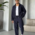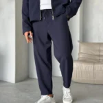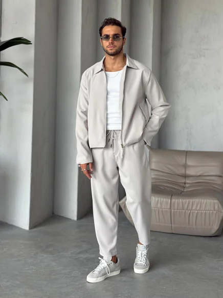 Този стилен мъжки комплект съчетава удобството на спортната визия с изчистения елегантен стил. Състои се от горна част със свободна кройка и панталон с ластичен колан и връзки за максимален комфорт. Меката материя и модерната линия го правят подходящ както за ежедневието, така и за по-специални поводи. Може да се комбинира лесно с тениска и кецове за завършена визия.